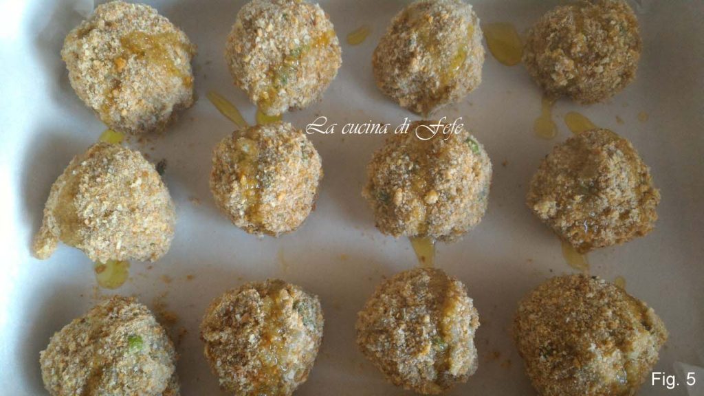 Plaats de arancinetti in een met bakpapier beklede bakplaat en besprenkel het oppervlak met een scheut olijfolie (fig. 5).