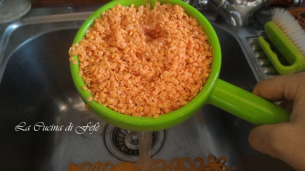Begin met het grondig spoelen van de rode linzen onder stromend water met behulp van een ruime zeef.