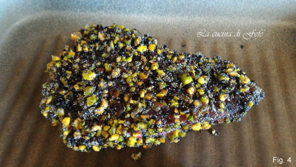 • Meng in een kom de pistachekruimels en de zwarte sesamzaadjes, en bedek de filets met het mengsel (fig. 2).
