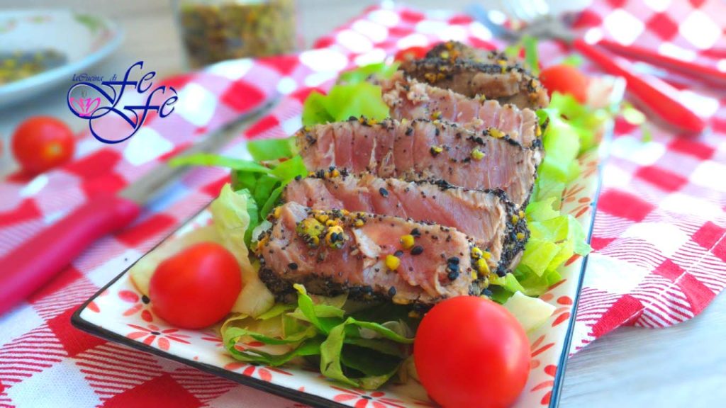 Na een korte zomerse pauze en een paar dagen rust in het strandhuis, ben ik terug met vol enthousiasme en eenvoudige maar smakelijke ideeën om in de keuken voor te stellen! Ik hoop dat jullie mij hebben gemist zoals ik jullie heb gemist, maar soms is het echt nodig om even los te komen van alles en iedereen, om te kunnen herstellen en weer goed van start te gaan! Ik moet bekennen dat ik, gebruikmakend van deze vakantiedagen, een beetje op dieet ben gegaan, en deze eerste recepten zullen in het teken staan van ingrediënten die inspireren door hun smaak, maar zonder overdaad! Wat ik jullie vandaag bijvoorbeeld voorstel, is een eenvoudig gerecht in zowel ingrediënten als bereidingswijze, maar met een uitstekende opbrengst en een groot visueel effect, wat nooit kwaad kan! Als je, net als ik, houdt van verse tonijn en pistachenoten, dan moet je het zeker proberen! De stukken zijn erg mals en smelten in de mond. De toevoeging van Bronte-pistachenoten en zwarte sesamzaadjes geeft externe een speciale knapperigheid die ik niet kan beschrijven, je moet het zelf ervaren! Eén waarschuwing. Hoe gemakkelijk en snel deze recept ook lijkt, er zijn toch valkuilen, en de eerste is de garing van de tonijn! Voor een optimaal resultaat, mag de filet nooit te lang garen, daarom raad ik aan om eerder het vuur uit te zetten om te voorkomen dat het vlees taai en droog wordt en zijn smaak verliest. Uiteraard raad ik drie minuten per kant aan, maar afhankelijk van de dikte moet je de kooktijden verlengen of verkorten. Aangezien deze tijden vrij kort zijn, zorg ervoor dat de tonijn vooraf diepgevroren is geweest om het risico van parasieten te vermijden. Eenmaal gekookt, kun je het in stukken gesneden serveren, vergezeld door een eenvoudige seizoenssalade zoals ik heb gedaan of, als je wilt, met gestoomde groenten. Vertrouw me, je zult een geweldige indruk maken!