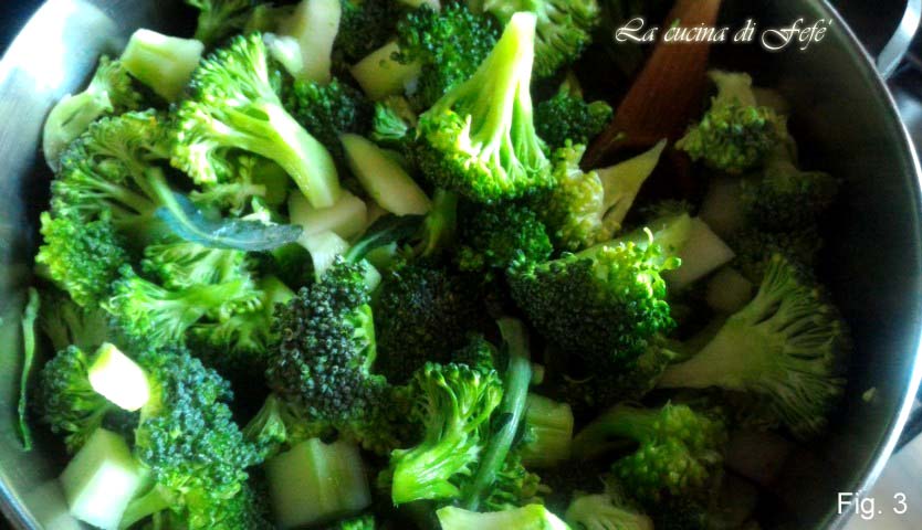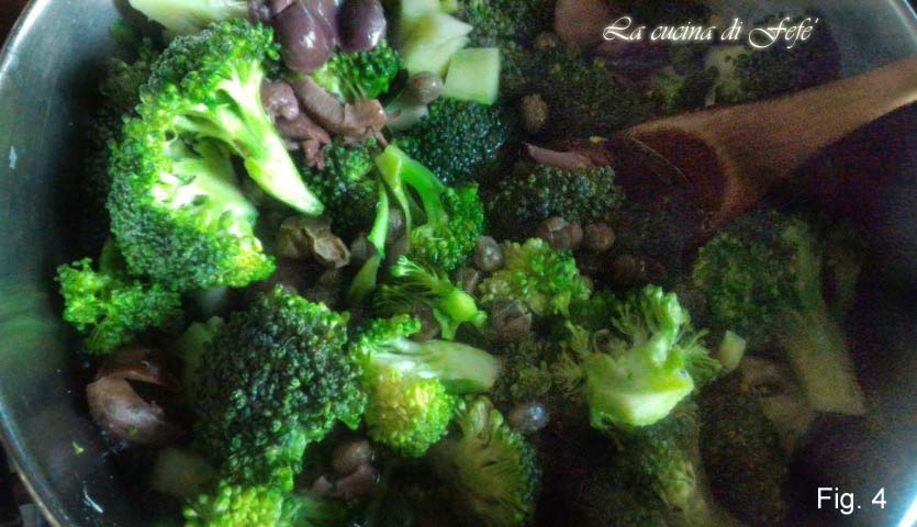 Blus af met de rode wijn, laat de alcohol op hoog vuur verdampen, verlaag dan het vuur en dek af met een deksel. Kook gedurende 35′-40′, zonder ooit het deksel op te tillen of te roeren. Beweeg de pan af en toe een beetje om te voorkomen dat de broccoli aan de bodem blijft plakken. Zet het vuur uit en laat 10 minuten rusten. Gebruik een spatel om de randen los te maken en serveer.