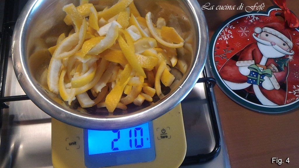 Na de inweektijd zijn de sinaasappelschillen zeer geurig en zacht. Laat ze goed uitlekken en weeg ze. De mijne waren 210 gram (fig. 4).