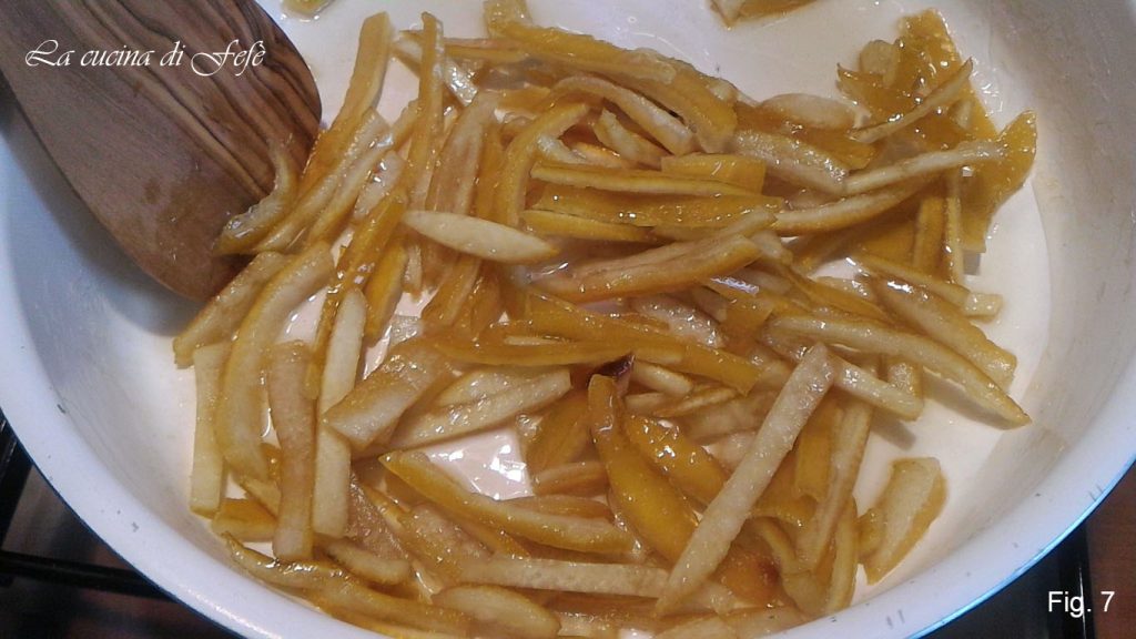Het is belangrijk dat de siroop volledig uitdroogt en dat de sinaasappelschillen goed glanzen, dus houd er altijd rekening mee dat de kooktijd kan verlengen afhankelijk van de hoeveelheden (fig. 7).