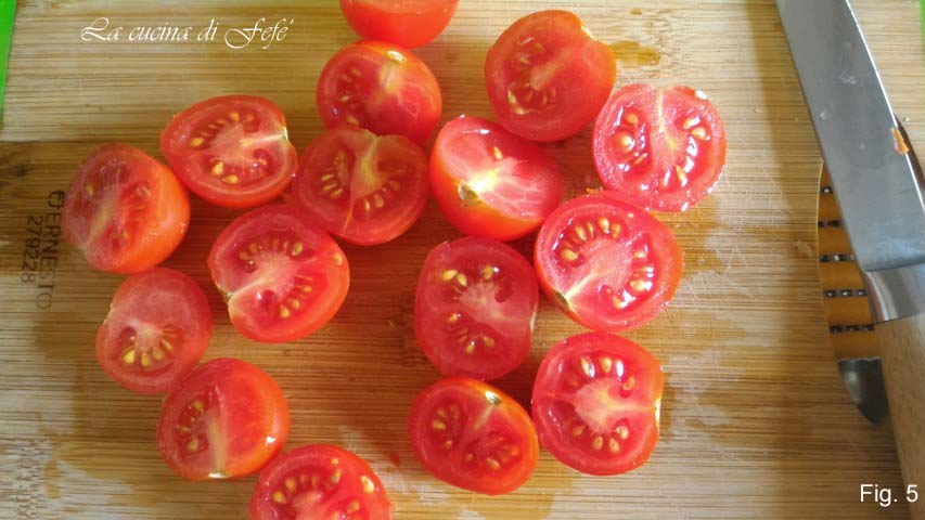 Was de cherrytomaatjes, droog ze af met keukenpapier en halveer ze.