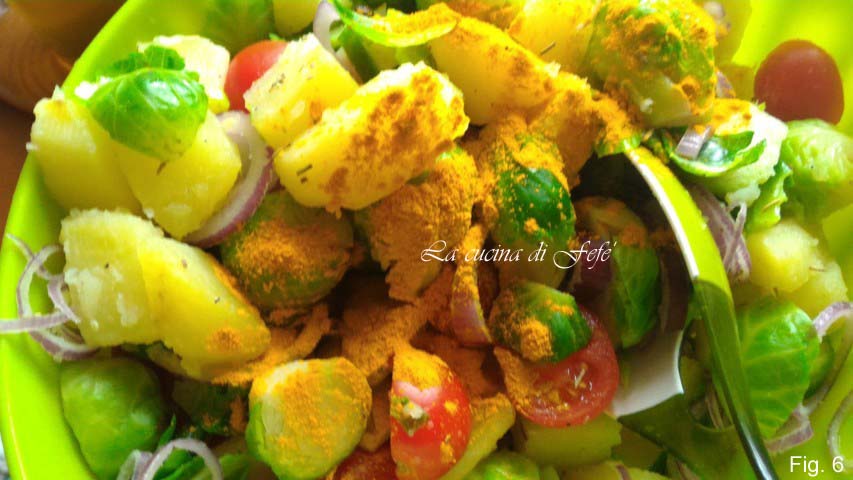 Blancheer de aardappelblokjes in kokend, licht gezouten water gedurende ongeveer 5′, zeef ze met een schuimspaan en doe hetzelfde met de spruitjes. Verzamel ze in een ruime kom en voeg de rest van de groenten toe, breng op smaak met zout en peper, bestrooi met gemalen knoflook en kurkuma en rozemarijn.
