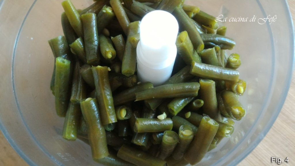 Om de sperziebonen pesto te maken, begin je met het schoonmaken ervan. Verwijder de uiteinden door ze met de hand af te breken of zoals ik deed, met behulp van een keukenschaar (fig. 1).