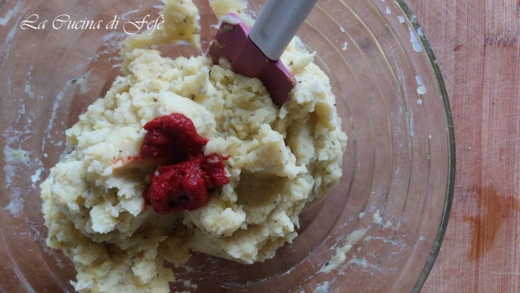 Ondertussen bereid je de vulling: meng in een kleine kom de verse roomkaas met de tomatenpuree.