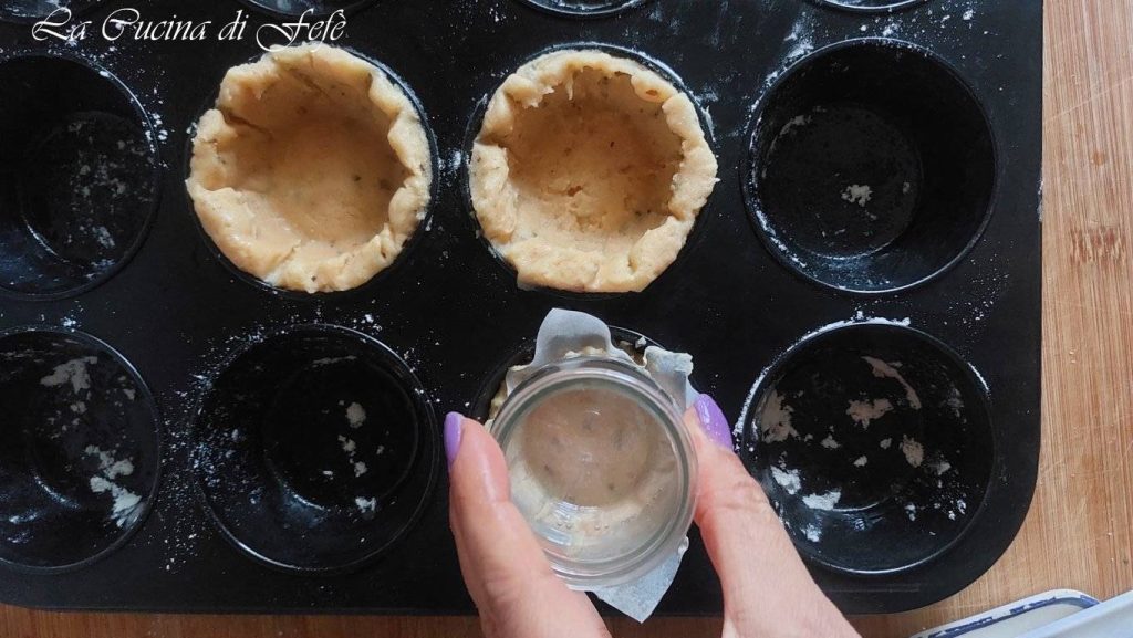 Gebruik een glas met een iets kleinere diameter dan de vormpjes en een goed bevochtigd en uitgeknepen vierkant stuk bakpapier om het mengsel plat te drukken tot een perfect mandje.