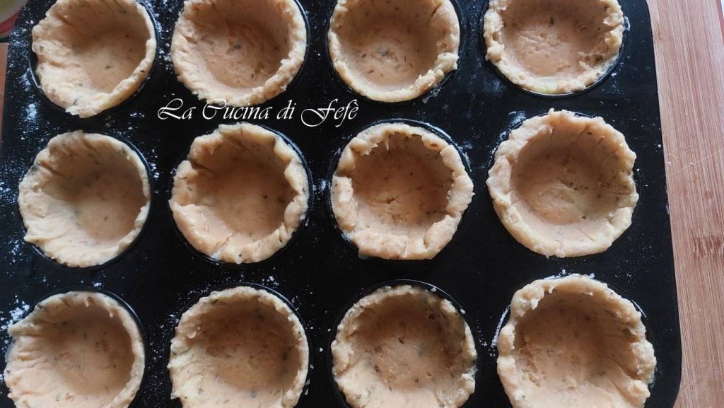 Haal de mandjes na de baktijd uit de oven en leg op de bodem van elk mandje een reepje rauwe ham, een ontpitte olijf in plakjes gesneden en een lepel kaascrème, goed aandrukken.