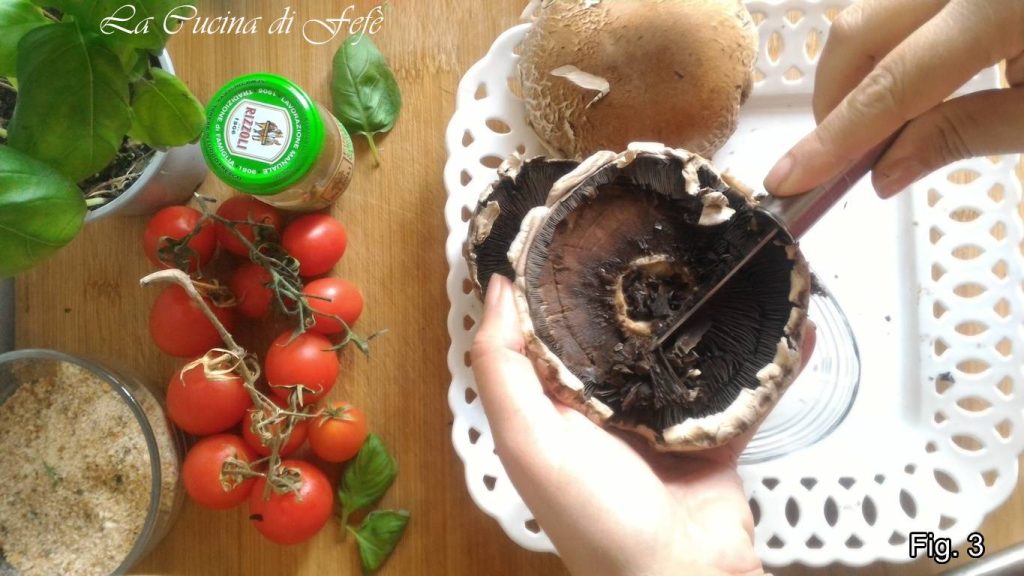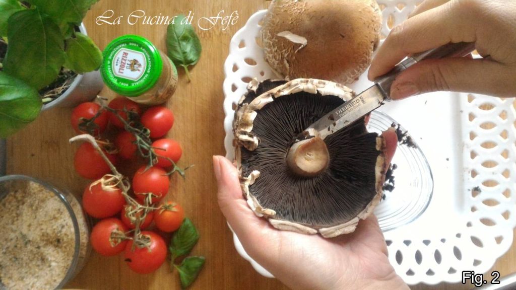 Begin met het reinigen van de champignonhoedjes met een licht vochtig keukenpapier om aarde resten te verwijderen (fig. 1).