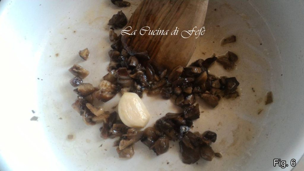 Verhit in een pan de knoflook met twee eetlepels olie en twee eetlepels water, voeg de in blokjes gesneden stelen toe en zet het vuur op laag (fig. 6). Laat ze 4′-5′ maximaal sauteren, voeg dan een beetje zout toe en breng op smaak met fijngehakte peterselie (fig. 7).