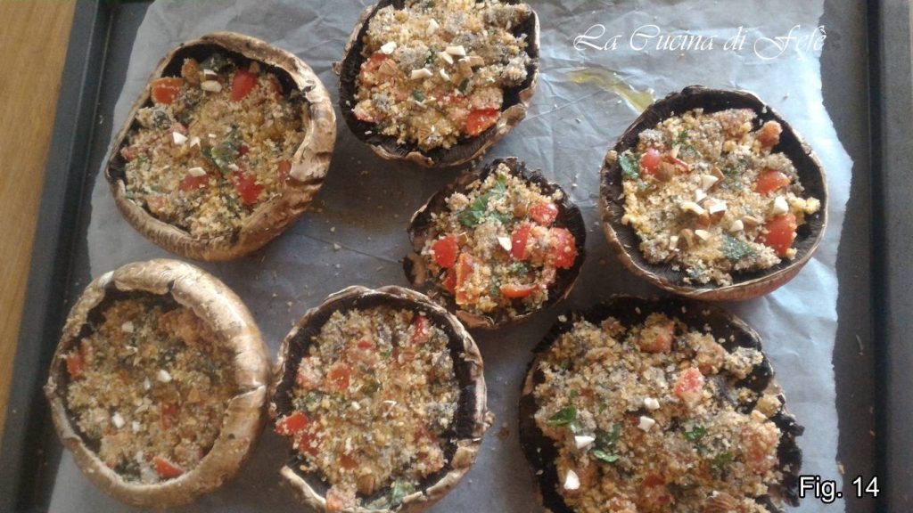 In deze periode vind ik nog steeds drie soorten champignons op de lokale markt bij mij in de buurt: de gebruikelijke Champignon, Pleurotus en Portobello champignons! Het zijn juist deze laatsten die me tijdens mijn boodschappenrondje hebben geïnspireerd, misschien omdat ze meer dan alle anderen perfect zijn om gevuld te worden met alles wat onze fantasie ons ingeeft! In mijn geval vooral met alles wat in de koelkast dringend moet worden opgebruikt! Gevulde Portobello champignons zijn perfect om de meest ongelooflijke en smakelijke vullingen te ontvangen, omdat ze mooi groot zijn! Afhankelijk van de vulling, kunnen ze een echte smakelijke en verrassend decoratieve tweede gang worden, en indien nodig een rustiek en smaakvol voorgerecht door bepaalde ingrediënten toe te voegen of te vervangen. Ik heb gekozen voor een zeer rijke paneerlaag op basis van paneermeel, Grana, biologisch handgefileerde ansjovisfilets, en tot slot amandelgranulaat voor een knapperige toets! Ze zijn in een paar stappen te bereiden en met mijn adviezen is succes aan tafel gegarandeerd.