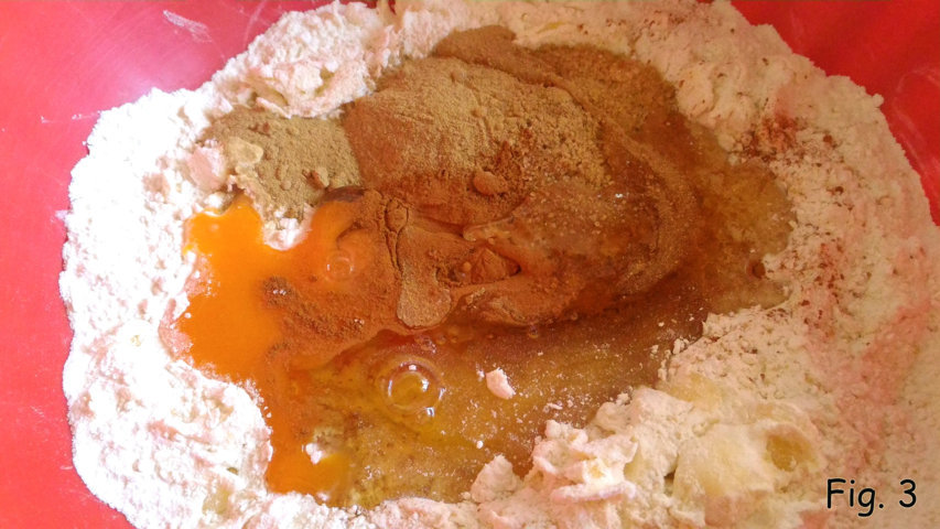 Bewaar je royal icing in een kom bedekt met plasticfolie en zet het in de koelkast klaar voor gebruik. Begin ondertussen met het maken van het deeg voor de koekjes, door in een andere kom de bloem samen met de koude boter in blokjes te mengen. Meng goed tot je een zanderige textuur krijgt, vorm dan een kuil en plaats in het midden het ei, de suiker, de kaneel, de gemberpoeder, de nootmuskaat, de baking soda, de honing en tot slot een snufje zout (fig. 3).