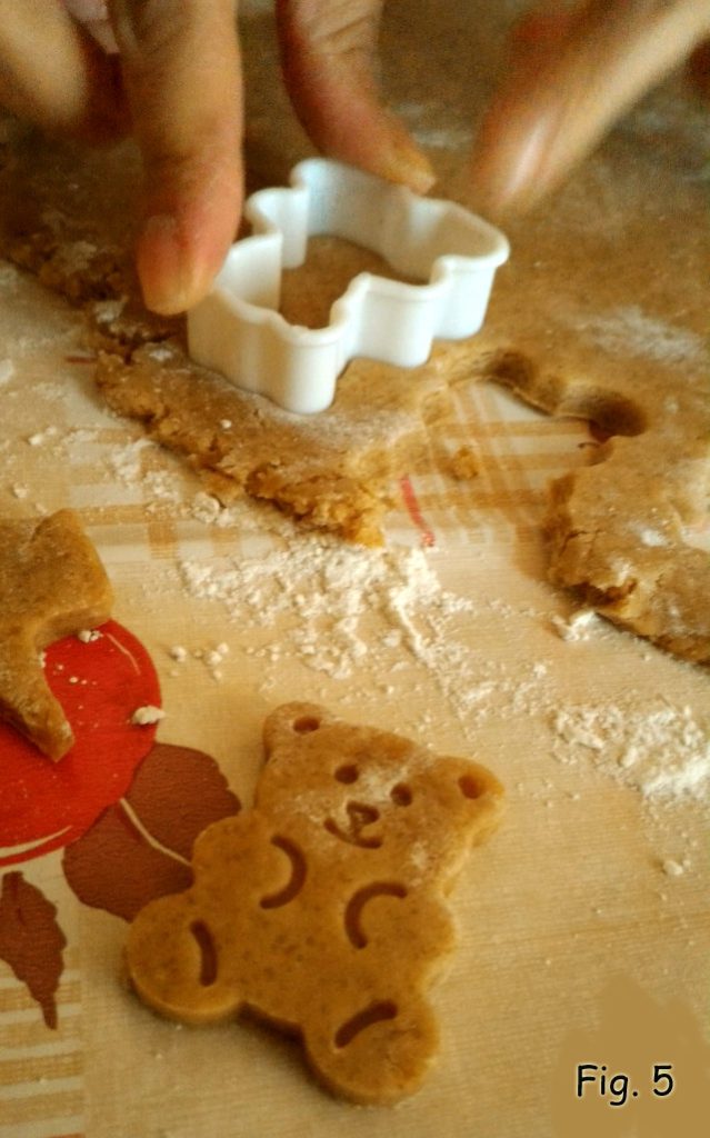 Plaats de deegbal in de koelkast gewikkeld in plasticfolie voor ongeveer 1 uur. Na deze tijd, verdeel de deegbal in twee delen en begin met het uitrollen van de eerste helft met een deegroller op een al bebloemd werkvlak, terwijl je de rest weer in de koelkast bewaart. Maak een deeg van ongeveer ½ cm dik en snijd het voorzichtig met je vormpjes tot het deeg op is (fig. 5).
