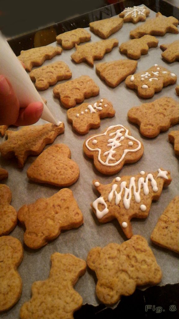 Laat ze volledig afkoelen op kamertemperatuur, en verplaats dan het eerder bereide glazuur in een wegwerp spuitzak, knip de punt dun af en decoreer ze op traditionele wijze of zoals je fantasie je ingeeft (fig. 7).