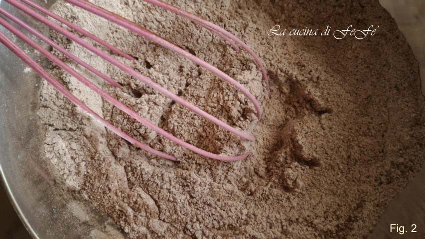 De volgende dag, doe in een ruime mengkom de droge ingrediënten bij elkaar, dus het rijstmeel, de cacao, het maïszetmeel en het gezeefde bakpoeder, de suiker en het zout.