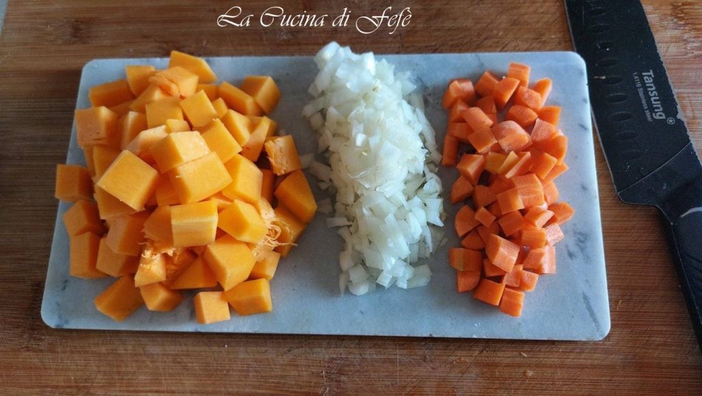 Om de soep te bereiden, begin je met de groenten: was en bereid de pompoen voor door de schil, draden en zaadjes te verwijderen, snijd deze vervolgens in regelmatige blokjes van ongeveer 1,5 cm.; maak de wortel schoon en snijd deze in brunoise, ofwel in blokjes van 5 millimeter dik. Doe tenslotte hetzelfde met de ui.