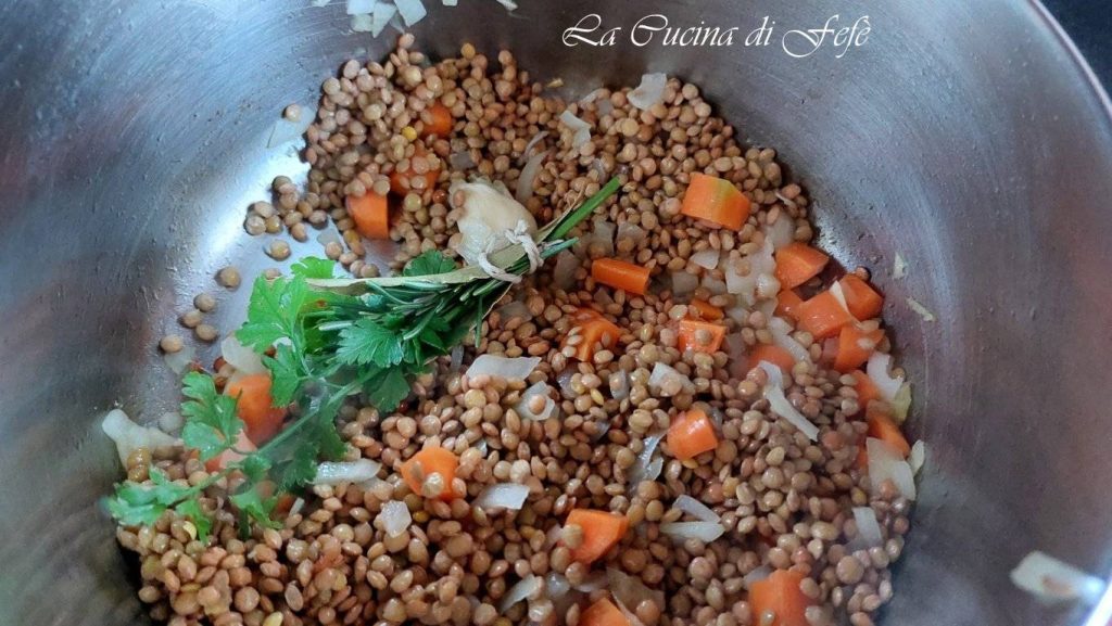 Voeg het bouquet toe aan de basis, voeg ook de brunoise van wortel toe, laat 1 minuut smaken en voeg dan de gedroogde linzen toe die eerder onder stromend water zijn afgespoeld.