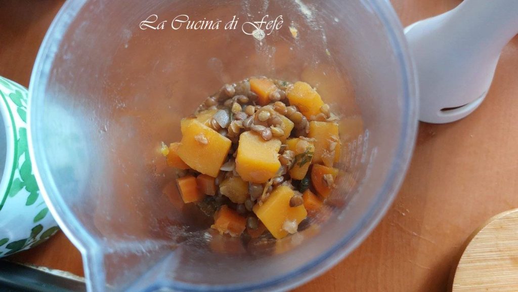Neem op dit punt drie pollepels pompoen en linzen en breng deze over in een staafmixer.