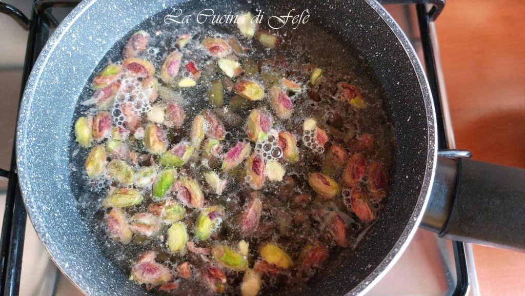 Het bereiden van pistachegranita is heel eenvoudig: blancheer de gepelde pistachenoten 1 minuut in water in een steelpan, zet dan het vuur uit en laat ze nog 5 minuten weken.