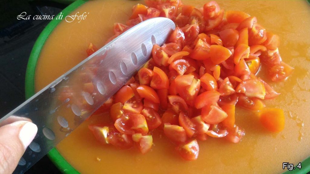 • Was en droog de kersentomaatjes met keukenpapier, snijd ze dan in vieren als ze groter zijn of doormidden voor kleinere.