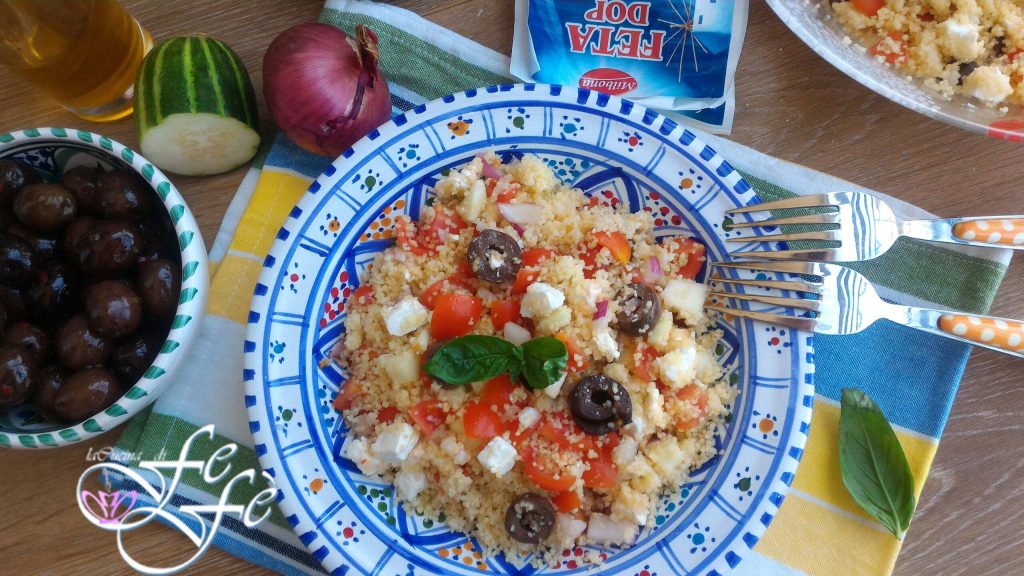 Misschien heb ik in deze zeven jaar bloggen nooit over mijn enorme liefde voor couscous gesproken! Het zal zijn vanwege de nauwe band met mijn land, aangezien het nog steeds, na de Arabische overheersing, een waar pronkstuk is in de Siciliaanse traditie van Trapani, met een festival in San Vito lo Capo! Het zou kunnen dat het een zeer veelzijdige basis is in de keuken, maar feit blijft dat ik het elke dag zou eten als ik kon! Het gerecht dat ik jullie vandaag presenteer is iets ongelooflijks unieks, omdat het drie culturen combineert, de Arabische, Griekse en Italiaanse cultuur. Een zeer geslaagde versmelting, waarin de culinaire erfenis van Marokko, Algerije en Tunesië de smaken van de Griekse en Italiaanse keuken ontmoet! Dit dankzij de feta in het eerste geval, een gerijpte halfharde maar brokkelige kaas gemaakt van geiten- en schapenmelk, en het gebruik in het tweede geval van de rode ui uit Calabrië, de kersentomaatjes uit Pachino en de Pugliese meloncella. Een combinatie die ik je ten zeerste aanbeveel om te proberen omdat het je zal verrassen wat betreft het eindresultaat en de eenvoud in de bereiding! Voor degenen die de kersentomaatjes en de meloncella niet kunnen vinden, kun je altijd kiezen voor tros- en komkommers. Het resultaat zal nog steeds geweldig zijn! Het is voldoende om de couscous een paar minuten te stomen, alle ingrediënten rauw te snijden en ze samen te voegen. Een kinderspel! Je krijgt een vegetarisch hoofdgerecht dat kleurrijk, vers en licht is, dat je ook een dag van tevoren kunt bereiden en kunt genieten tijdens je zomerlunches in de buitenlucht of bij informele diners met vrienden! Probeer het en laat het me weten.