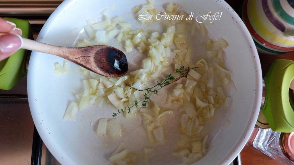 • In een braadpan, laat de ui twee minuten op hoog vuur verwelken, niet te fijn gesneden met 3 eetlepels olie en 2-3 takjes verse tijm, maar zonder te verbranden.