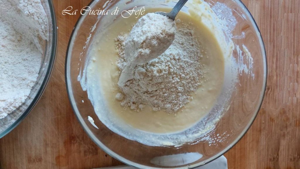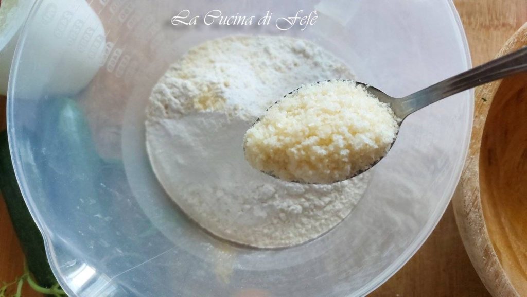 In een ruime kom meng je de droge ingrediënten, namelijk de bloem met de gezeefde gist, de geraspte Parmezaan en een snufje zout.
