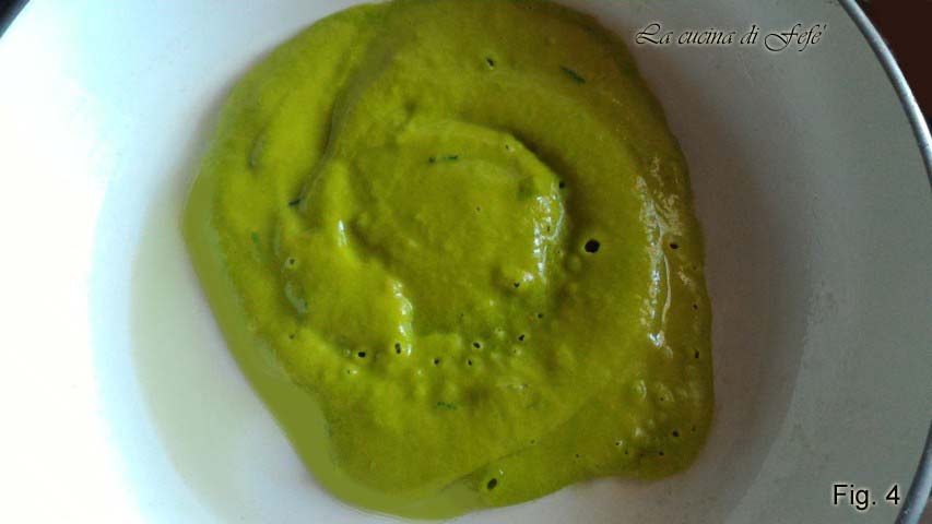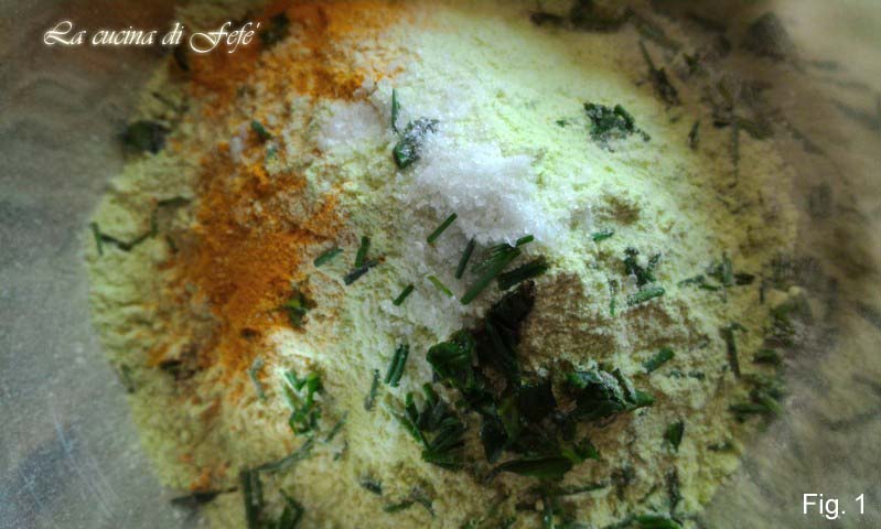 • Meng in een grote kom het erwtenmeel , gezeefd, met de kurkuma, de fijngesneden basilicum, munt en bieslook, een snufje zout en een draai van de peper (fig. 1).