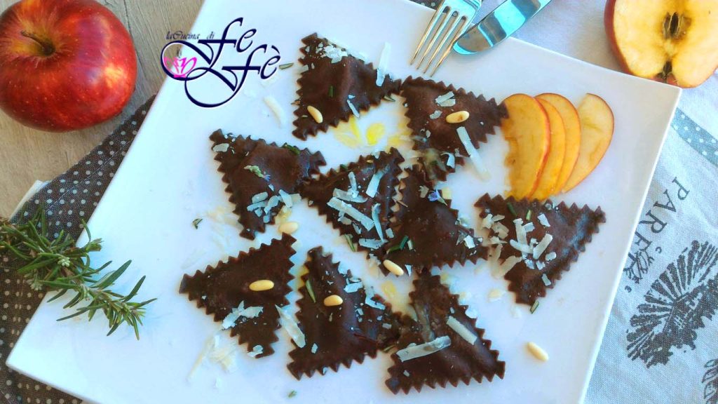 En hier is, zoals beloofd, het eindgerecht van deze prachtige zelfgemaakte ravioli! Als je genoeg hebt van de gebruikelijke met ricotta gevulde ravioli, kies dan voor dit eenvoudige gerecht, rustiek maar elegant. De ongewone kleur van het deeg dankzij de cacao, zonder eieren, zal je gasten verrassen en nog meer bij het proeven, dankzij een krokante vulling van Parmezaanse kaas en appels. Het knapperige, aromatische en zoete vruchtvlees van de Red delicious appels, in contrast met de uitgesproken sterke en aangenaam pittige smaak van de gerijpte pecorino, zal een echt unieke combinatie creëren! Een hoofdgerecht in vegetarische stijl, zeer eenvoudig in zijn essentie, maar verfijnd en indrukwekkend.