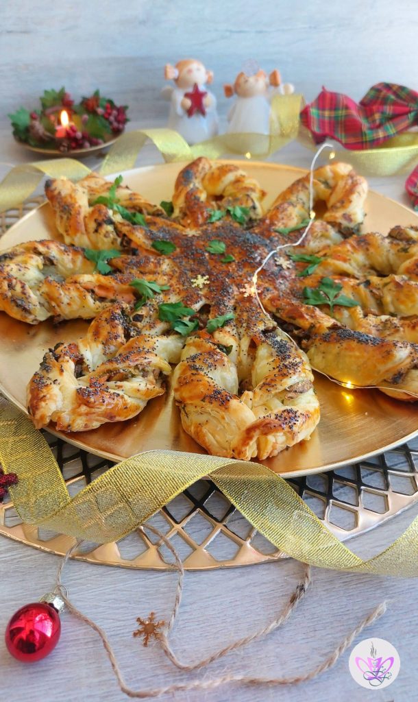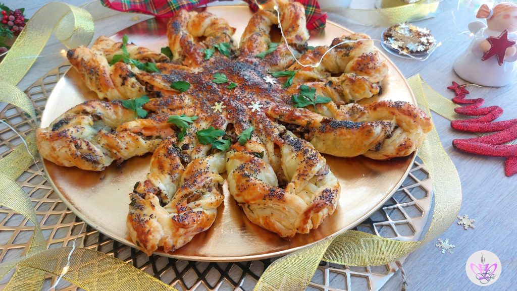 Ontdek het recept voor de Hartige Bladerdeegsneeuwvlok, een elegante en snelle hartige taart perfect als kerstvoorgerecht. Ideaal voor buffetten en aperitieven!