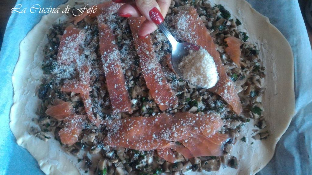 Vanwege zijn veelzijdigheid, kan deze hartige sneeuwvloktaart verschillende variaties aan, zelfs zoete, die aan elke smaak kunnen voldoen. De verschillende vullingsopties kunnen variëren afhankelijk van het seizoen en de smaak of dieetwensen van je gasten. Ik heb bijvoorbeeld gekozen voor de klassieke en verfijnde combinatie van gebakken champignons en gerookte zalm. Als je van vleeswaren houdt, kun je eenvoudig vervangingen of varianten maken, zoals ik aan het einde van het recept aanbeveel.