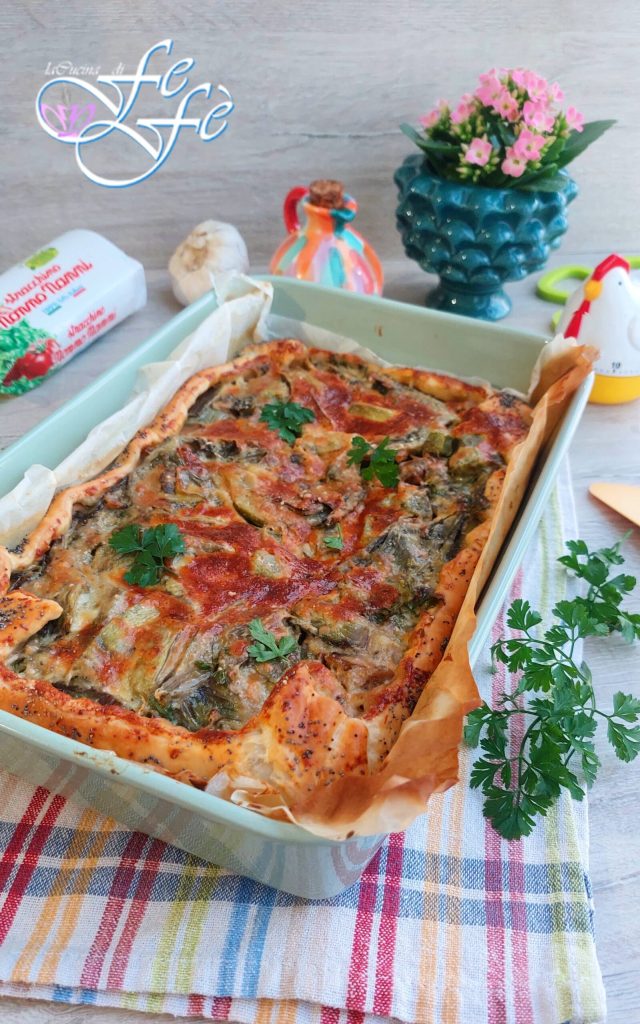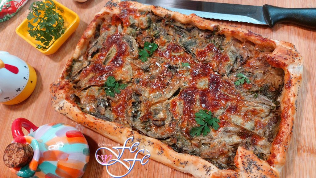 Een paar weken geleden liet ik op sociale media de heerlijkheid van deze hartige taart zien met slechts een eenvoudige video terwijl ik hem uit de oven haalde, omdat ik ervoor had gekozen hem niet te fotograferen vanwege het winterlicht dat niet geschikt is voor foodfotografie! Toch had ik mezelf voorgenomen om het voor een andere gelegenheid en op een ander moment van de dag opnieuw te maken om het recept met jullie te delen! Persoonlijk vertrouw ik voor mijn werk altijd liever op natuurlijk licht, maar in de winter is dat erg moeilijk, omdat je misschien begint met de zon en het al vroeg in de middag bijna donker is, vaarwel foto’s! Helaas was het ook niet voorbestemd om bij mijn tweede poging te slagen! Ik wilde graag helderdere foto’s maken, maar ik liet me weer afleiden en uiteindelijk moest ik kunstlicht gebruiken! Hopelijk komt de heerlijkheid van deze rustieke taart, die eigenlijk de echte ster is, toch over! Een bladerdeeg jasje met een heerlijke vulling van artisjokharten, gesauteerde champignons en stracchinoroom! Een rustieke taart geschikt voor elke gelegenheid, dus het kan worden geserveerd als vegetarisch voorgerecht, op een buffet, misschien vergezeld van een aperitief, of als hoofdgerecht, verdeeld in plakken kan het een goed alternatief zijn voor het diner. Deze taart kan zowel warm als koud worden genoten, zoals je wilt, hij is ook heerlijk om mee te nemen voor picknicks of voor de lunchpauze op het werk. De versheid van het versgebakken bladerdeeg en de zachtheid van de vulling met artisjokken en champignons maken deze taart ongelooflijk smakelijk en aantrekkelijk voor al je gasten! Geloof me, je zult je vingers aflikken!