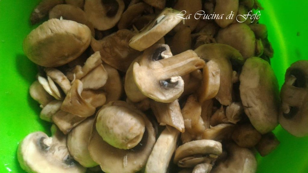 Begin met het reinigen van de champignons met een goed vochtige schone doek om de aarde te verwijderen*, snijd vervolgens de uiteinden van de stelen en snijd ze verticaal in plakjes, beginnend vanaf de hoed richting de steel, en niet te dun, omdat ze tijdens het koken krimpen.