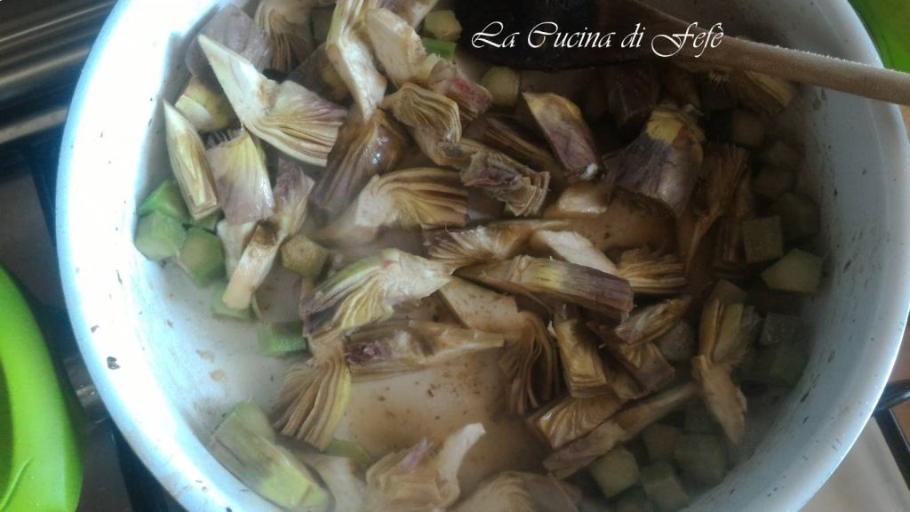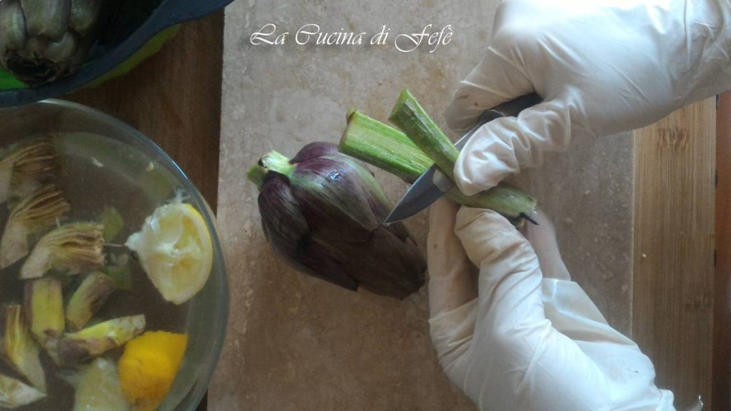 Ondertussen, bereid de artisjokken voor: bereid in een ruime kom zuur water met citroensap, dit voorkomt dat ze oxideren bij contact met lucht. Snijd vervolgens met een mes de bloemen van de stelen en verwijder de buitenste laag van de laatste, die bijzonder taai is.