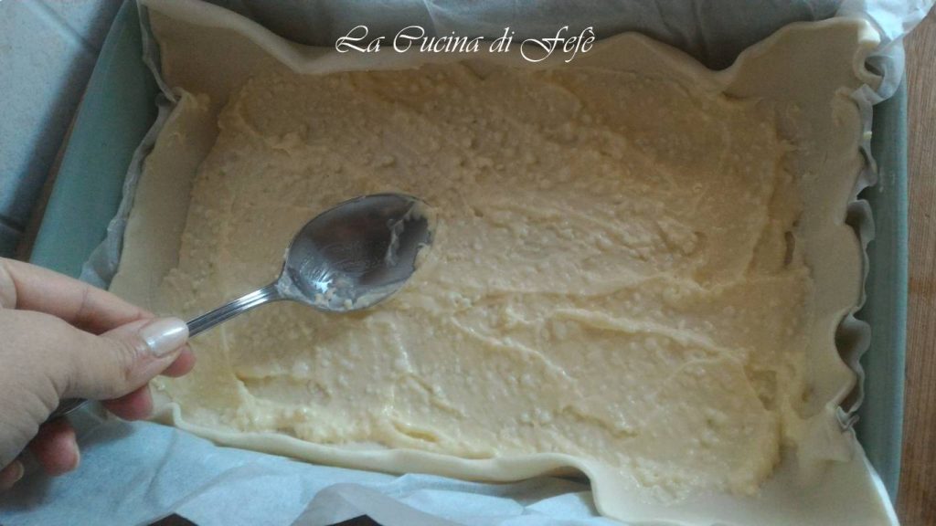 Rol het bladerdeeg uit en leg het in een bakvorm met het meegeleverde bakpapier. Verdeel de stracchinoroom over de bodem, bewaar een paar eetlepels voor de bovenkant.