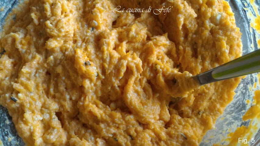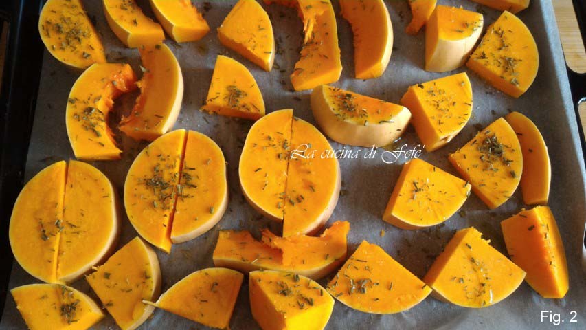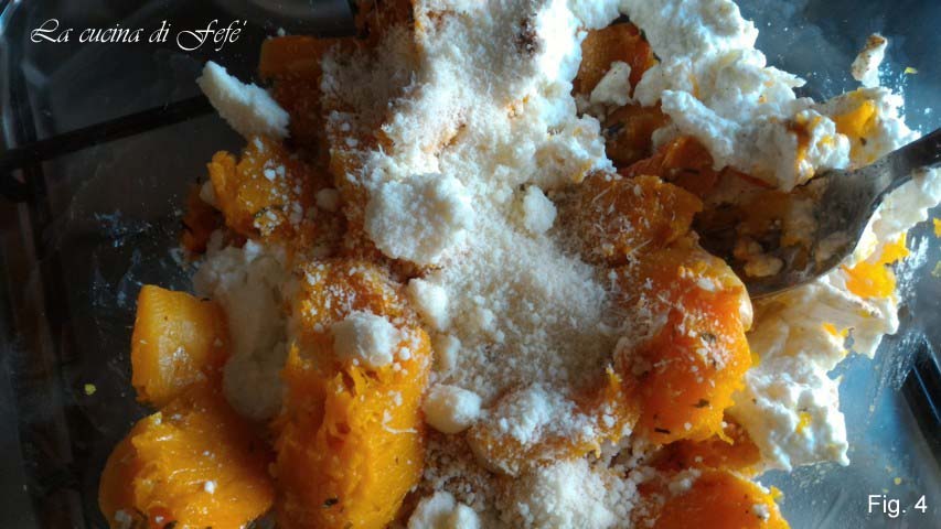 • Zet 30 minuten in de oven op 200°C, verwijder dan de schil van de pompoen, plet het in een kom met een vork en meng het met de ricotta (fig. 3).