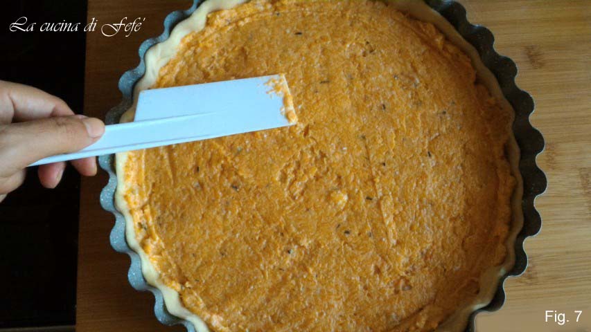 • Vul uw quiche met het pompoen-ricottamengsel en strijk het glad met een spatel (fig. 7).
