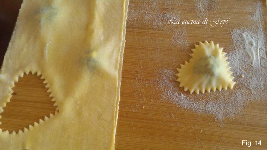 Leg het tweede deegvel erover, zorg ervoor dat de randen op elkaar aansluiten en zorg ervoor dat je de lucht tussen de ravioli eruit drukt door rondom de vulling met je vingers te drukken, zodat ze tijdens het koken niet open gaan. Snijd dan met de stempel de ravioli volgens de richting van de basis.