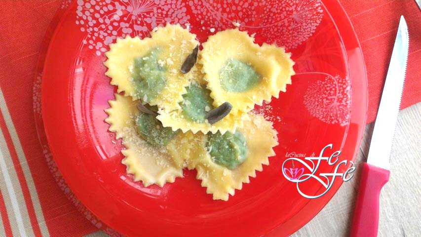 En voilà… de ravioli met ricotta, spinazie en pecorino zijn klaar om gekookt te worden! Laat ze in kokend water vallen en kook 2′-3′, totdat ze boven komen drijven. Ik serveerde ze met boter, salie en pecorino