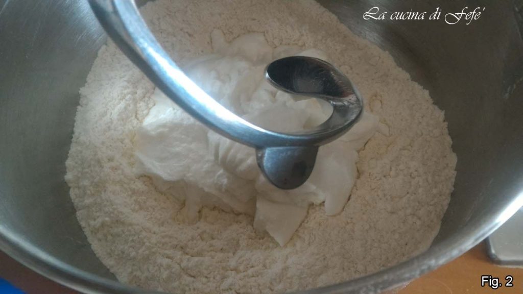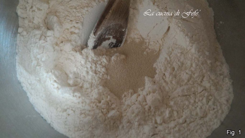 • In de kom van een keukenmachine, voeg de twee gezeefde bloemsoorten en de gist toe en roer met een houten lepel.