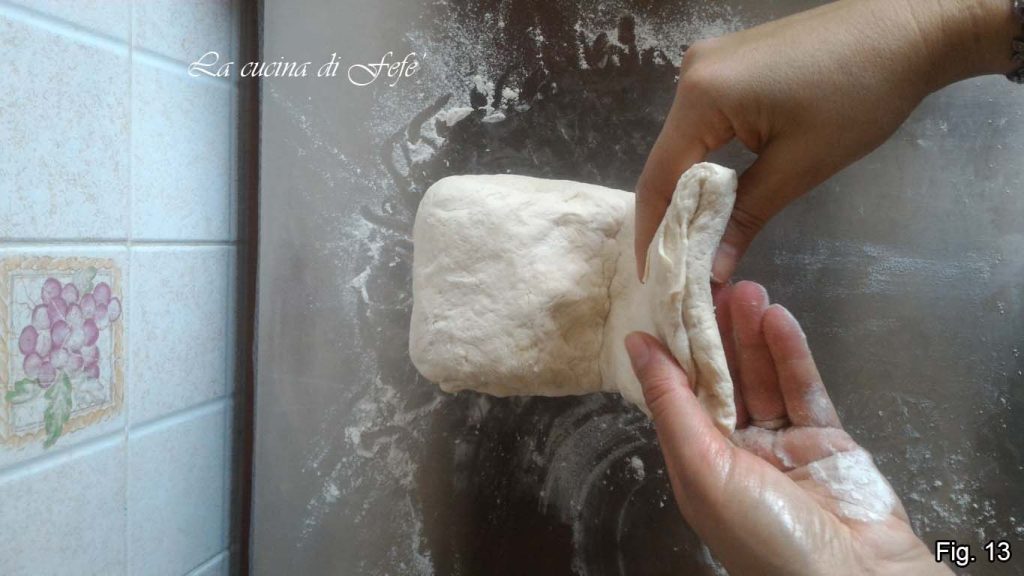 • Voer vervolgens een boekvouw uit, waarbij je een flap van het deeg naar het midden vouwt.