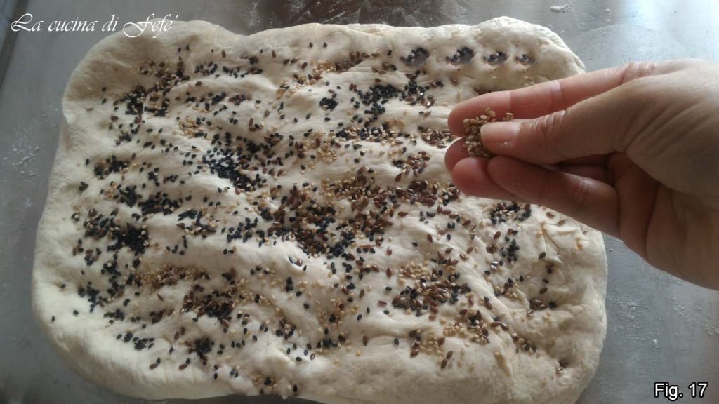 • Plaats het deeg in een met bakpapier beklede cakevorm. Bedek met een doek en laat opnieuw rijzen in een uitgeschakelde oven met het licht aan, voor 2-3 uur of tot het de randen van de vorm heeft bereikt*. Bestrijk het oppervlak vervolgens met een beetje haverdrank en bestrooi met de mix van olierijke zaden, havervlokken en rode quinoa (fig. 20).