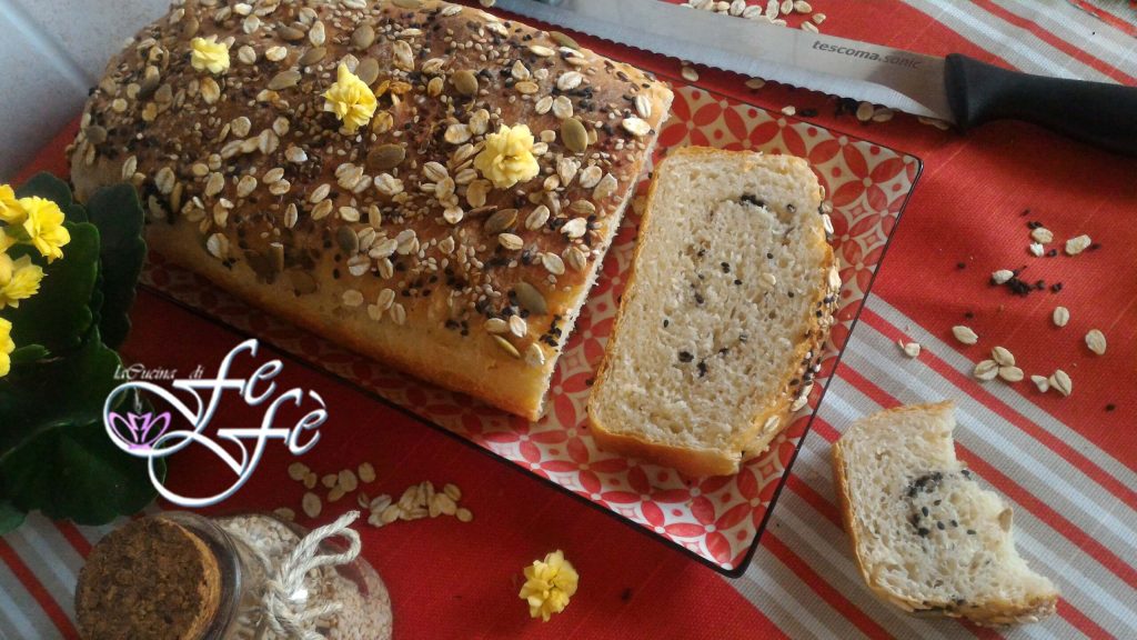 De zomer loopt helaas ten einde, iets dat ik nooit graag accepteer, maar ik ben tenminste getroost door het feit dat de temperaturen geschikter worden om de oven weer aan te zetten! En in dat opzicht is, na de lange zomerpauze, ook de rubriek Il Granaio, weer geopend om jullie enkele nieuwe ideeën te laten zien die ik hoop dat jullie leuk vinden! In de mand van deze eerste afspraak van de maand september vinden jullie dit havermoutbrood, gemaakt met bloem, melk en havervlokken. Aan deze al geweldige ingrediënten heb ik ook Griekse yoghurt toegevoegd, wat het deeg licht, geurig en zeer verteerbaar maakt, en een mix van olierijke zaden en rode quinoa, zowel binnen als buiten het deeg. Ik vind het ongelooflijk lekker, naast gezond in vergelijking met die voorverpakte producten, allemaal behandeld aan de oppervlakte met ethanol ofwel ethylalcohol. Het is waar dat het gebruik ervan een antimicrobiële functie heeft, namelijk het voorkomen van schimmelontwikkeling die in dit type bereiding snel een vruchtbare voedingsbodem zou vinden. En het is ook waar dat het gebruik van ethanol in havermoutbrood goed gereguleerd is en geen enkel risico voor onze gezondheid inhoudt, maar laten we het hebben over de onaangename geur en de authenticiteit van een alternatief product dat thuis wordt gemaakt? Er zijn geen vergelijkingen! Bovendien wordt het gemaakt met weinig ingrediënten en allemaal van hoge kwaliteit! En, laat me dat zeggen, hoewel de bewerking misschien wat lang en arbeidsintensief lijkt, zal het eindresultaat de wachten belonen! In plakjes gesneden, zal het al jullie gerechten begeleiden!