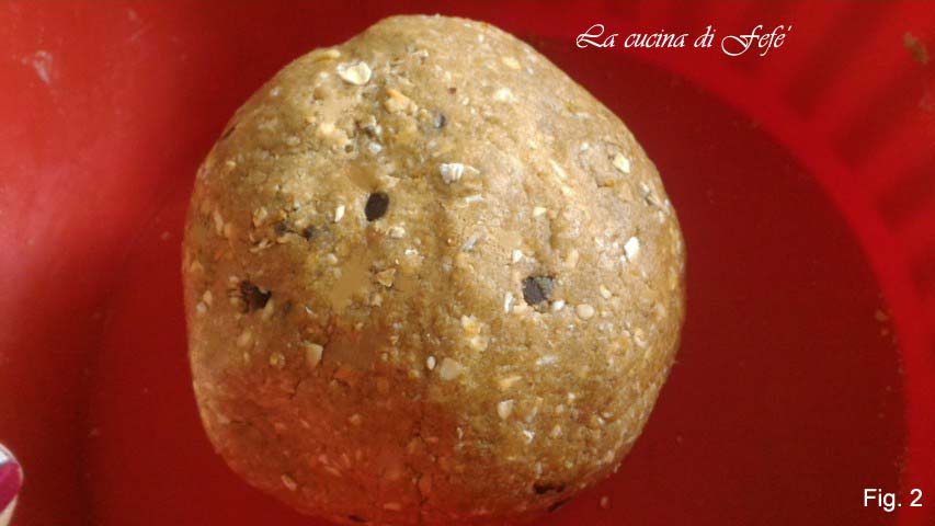Ga verder volgens de stappen van het basisrecept tot en met stap 4, en laat de citroenschil weg. Begin met het mengen van de ingrediënten met een houten lepel vanuit het midden, en werk geleidelijk naar buiten om de rest te incorporeren. Ga daarna verder met je handen en voeg als laatste de chocoladestukjes toe (fig. 1).