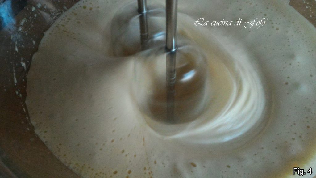 • Klop in een grote kom met een elektrische mixer de eieren met de suiker gedurende 10′ (fig. 3).