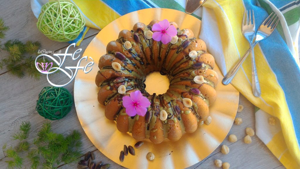 Ter gelegenheid van de tweede afspraak van de maand voor de rubriek Il Granaio, hier ben ik met een rijke nootachtige cake, specifiek op basis van hazelnoten en pistachenoten uit Bronte! Een bundtcake gemaakt voor een dierbare vriendin die glutenintolerant is, dus alleen met ingrediënten die daar volledig vrij van zijn! Het idee was om het nuttige met het aangename te combineren door een cake te maken die haar ontroert en bijdraagt aan de rijkdom van de mand samen met mijn andere collega’s! Ik wilde een extreem hazelnootsmaak aan deze cake geven, en ik denk dat ik daar ruimschoots in geslaagd ben! Inderdaad, de hazelnoten worden bijna tot meel gemalen en samen met maïszetmeel en rijstmeel aan het beslag toegevoegd! Bovendien, om een nog uitgesprokener smaak te geven, koos ik ervoor om het verder te parfumeren door yoghurt en hazelnootmelk toe te voegen! Natuurlijk, aangezien de bundtcake zelden alleen met poedersuiker wordt geserveerd, koos ik ervoor om het te garneren met hazelnoot en pistache smeerpasta! Inderdaad, de bijzonderheid van deze taart ligt in zijn vorm, tegenwoordig meer dan in het verleden, dankzij de groeven die elke soort glazuur kunnen opvangen! Een laatste overweging die ik nodig acht, is dat je voor het maken van deze cake niet per se deze soort vorm nodig hebt; je kunt het ook in een eenvoudige tulbandvorm maken, maar het zal niet hetzelfde zijn, omdat het uiterlijk deel uitmaakt van zijn betekenis. Denk erover na!