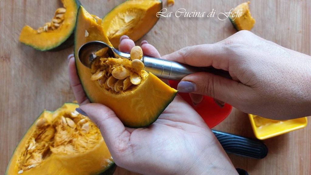 Begin met het snijden van drie plakken pompoen met een totaal gewicht van ca. 360 gr. met een mes. Verwijder met een meloenboor de interne zaden die je voor veel toepassingen in de keuken of voor tuinieren kunt gebruiken.