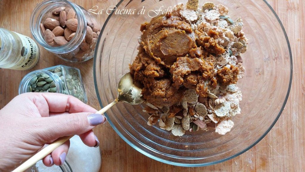 Na het succes van de granola zonder toegevoegde suikers, hoop ik dat deze andere versie, herfstgranola met pompoen, met kruidige en omhullende smaken, ook gewaardeerd wordt. Perfect voor een ontbijt om je yoghurt te verrijken of als tussendoortje. Opnieuw valt de keuze op zelfgemaakt om al die industriële en van lage kwaliteit ingrediënten te vermijden die helaas rijkelijk aanwezig zijn in commerciële producten, zoals gehydrogeneerde oliën, glucosestroop, suikers en verzadigde vetten. De tijd om deze granola te maken is echt kort, je hoeft alleen maar alle ingrediënten in een kom te mengen en ze in één laag op een bakplaat te leggen! Het enige struikelblok is het vooraf moeten koken van de pompoen om er puree van te maken, een verplichte stap, maar het zal de moeite waard zijn voor zowel smaak als voedingskwaliteit! De pompoen is immers een zeer voordelige, veelzijdige, caloriearme en gemakkelijk verteerbare groente. Het is vanzelfsprekend dat het vaker gebruiken ervan aan tafel altijd een goed voornemen is om te zorgen voor alle voedingsstoffen en antioxidanten die we nodig hebben. Geniet ook buitenshuis van deze granola als tussendoortje, maar let op, experts raden een portie van ongeveer 40 gram per dag aan, gelijk aan ongeveer 4 eetlepels. Deze hoeveelheid zou het mogelijk maken om van de voordelen te genieten zonder de dagelijkse calorie-inname te overschrijden, vooral voor degenen die een gecontroleerd dieet volgen of hun gewicht willen behouden.