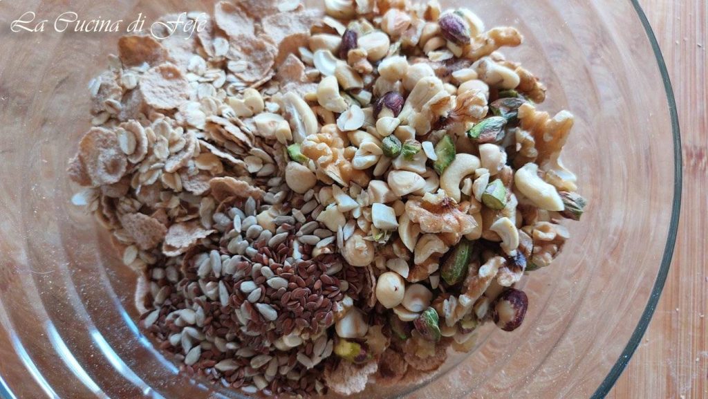 Het bereiden van zelfgemaakte granola is heel eenvoudig. In een grote kom meng en meng je de havervlokken met de speltflakes zonder suiker.